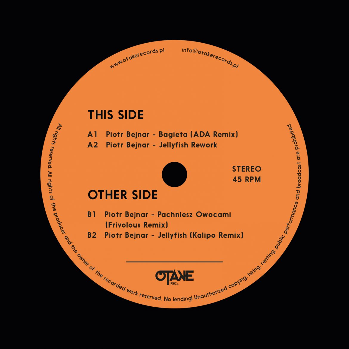 12 months after the debut album of Piotr Bejnar was released, we achieved gathering 4 remixes from this album. Piotr turned to the artists he most admired and who stated for him as great authorities. The record starts with a beautiful remix of the song “Bagieta” made by Ada from Pampa records. Second song on is a dance version of the “Jellyfish” made by Piotr Bejnar himself. The third artist on the record is Piotr’s idol from many years – Frivolous. To this one Piotr stood up to since childhood as a long- term fan of Frivolous, buying his albums and tracking his path. And now as for the crowning of the record – stands an artist closely related to Otake records – Kalipo with a total hit remix of “Jellyfish”
