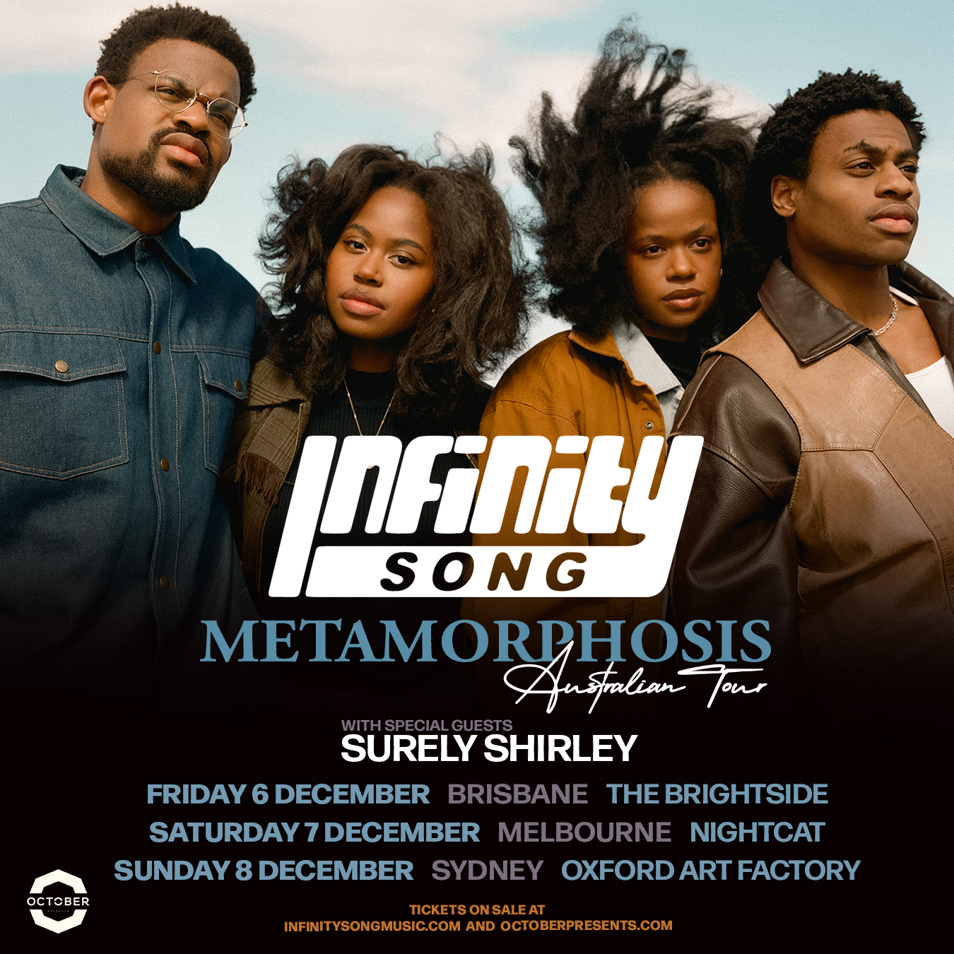 Australian audiences will soon be able to enjoy the full Infinity Song experience when the band makes their debut appearances on the East Coast this summer with special guests just announced, SURELY SHIRLEY.