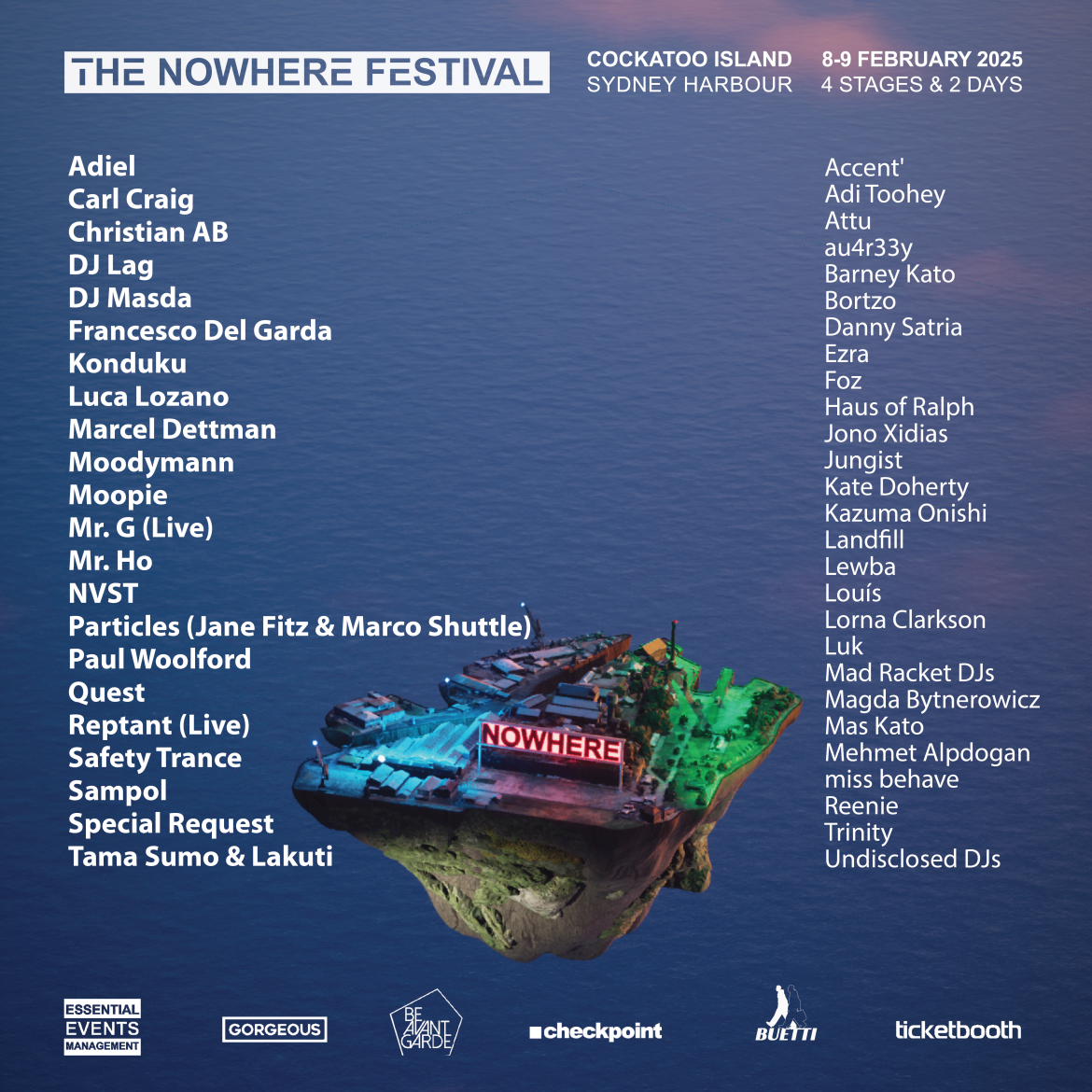 A unique vision of festive revelry from Jody Coker of Essential Events Management – the Australian promoter responsible for some of the world’s best parties and music events, including the annual Gorgeous Presents NYE party at the Museum of Contemporary Art (MCA) Australia – THE NOWHERE FESTIVAL launches in Sydney with bold plans for expansion and future editions slated for the UK, Dubai and Barcelona.