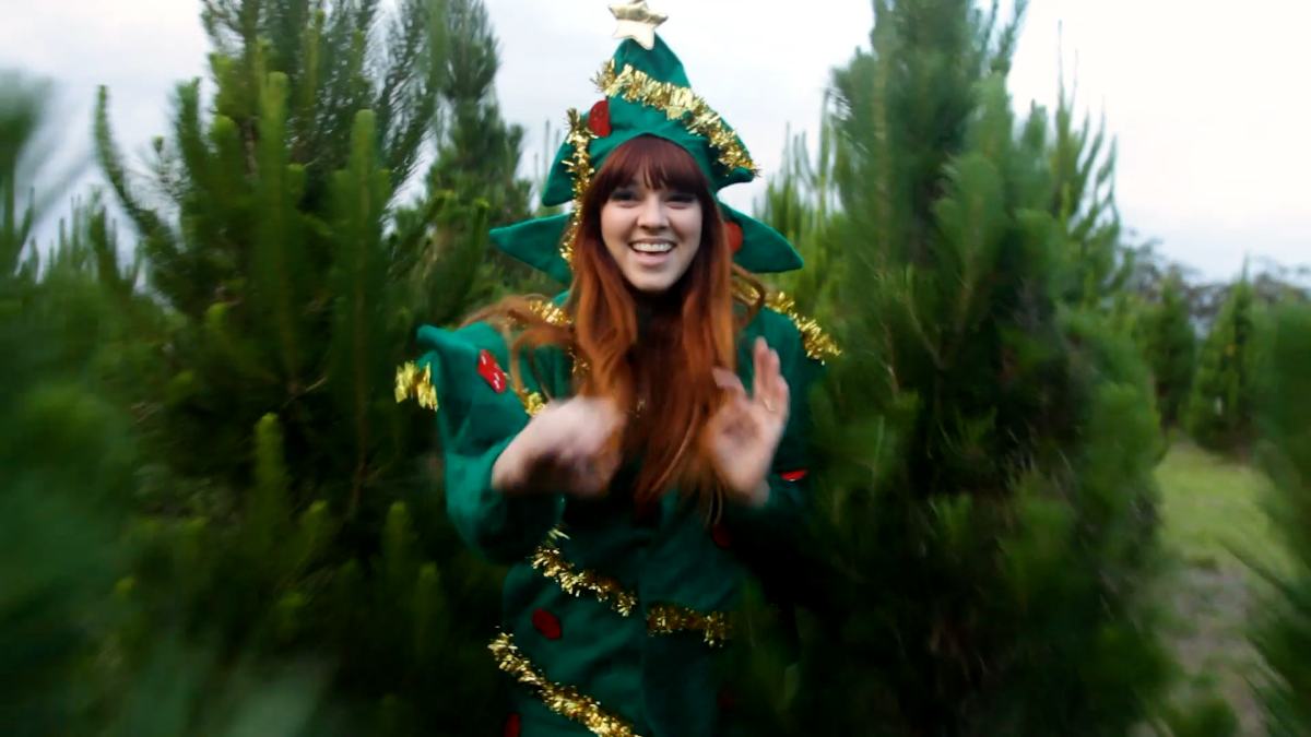 “I told Tim that I wanted the music video for Giftcard to be as awkward as Christmas sometimes is, and he really came up with the goods. I actually got a lot of compliments on the jacket while we were shooting. I like how we ended up creating this journey from all of the tacky, over the top parts of Christmas to the Tree farm, which was really natural and beautiful.” – Kay Proudlove