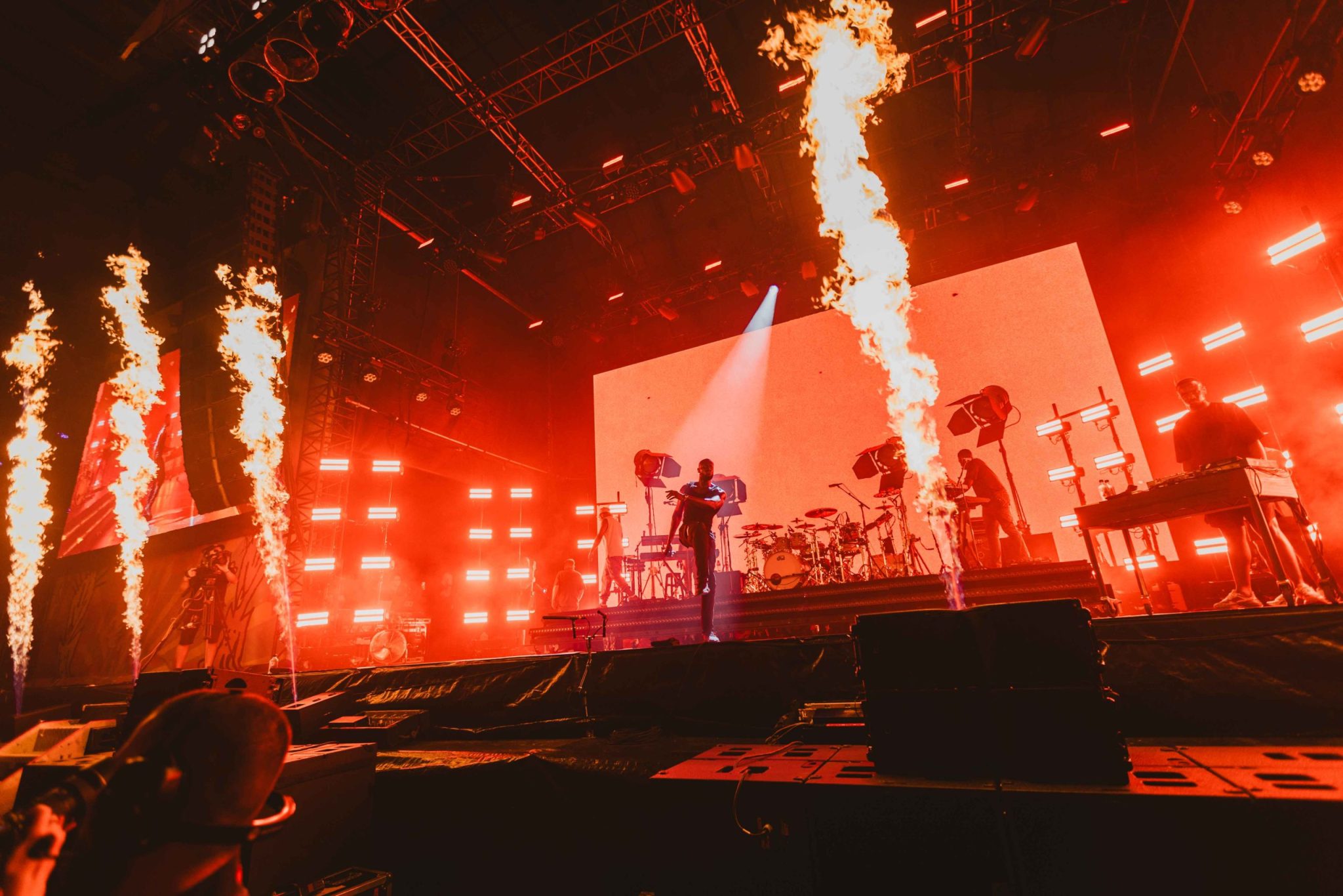 Over on the Hope Springs stage, the fresh faced D4vd graced the stage. D4vd had grown into his own as an artist with a collection of his songs becoming viral on TikTok, among them being ‘Romantic Homicide’ and ‘Here With Me’, a song that he had enlisted some help performing on stage from his younger sister Emily. The crowd swayed in awe of his energy and talent towards his songs, singing his lyrics at the top of their lungs in unison above the melodic instrumental atmosphere provided by his backing band. Following was a passion filled back-to-back performance from two of the UK’s most notable acts, Raye & AJ Tracey back on the main stages. Raye’s mesmerising vocal runs and energetic pop style was put on full display, with the help from her equally powerful band providing a huge sound that helped match her energy through hits ‘Prada’ and ‘Escapism’. AJ Tracey had sparked the crowd with his dynamic performance, heavy hitting track ‘Seoul’ running through the subwoofers giving the crowd a well needed energy hit as we headed towards the headliners. “Thiago Silver is coming” repeated AJ to the crowd throughout his set, a promise that he delivered with the help of an eager fan from the crowd to deliver an explosive ending.