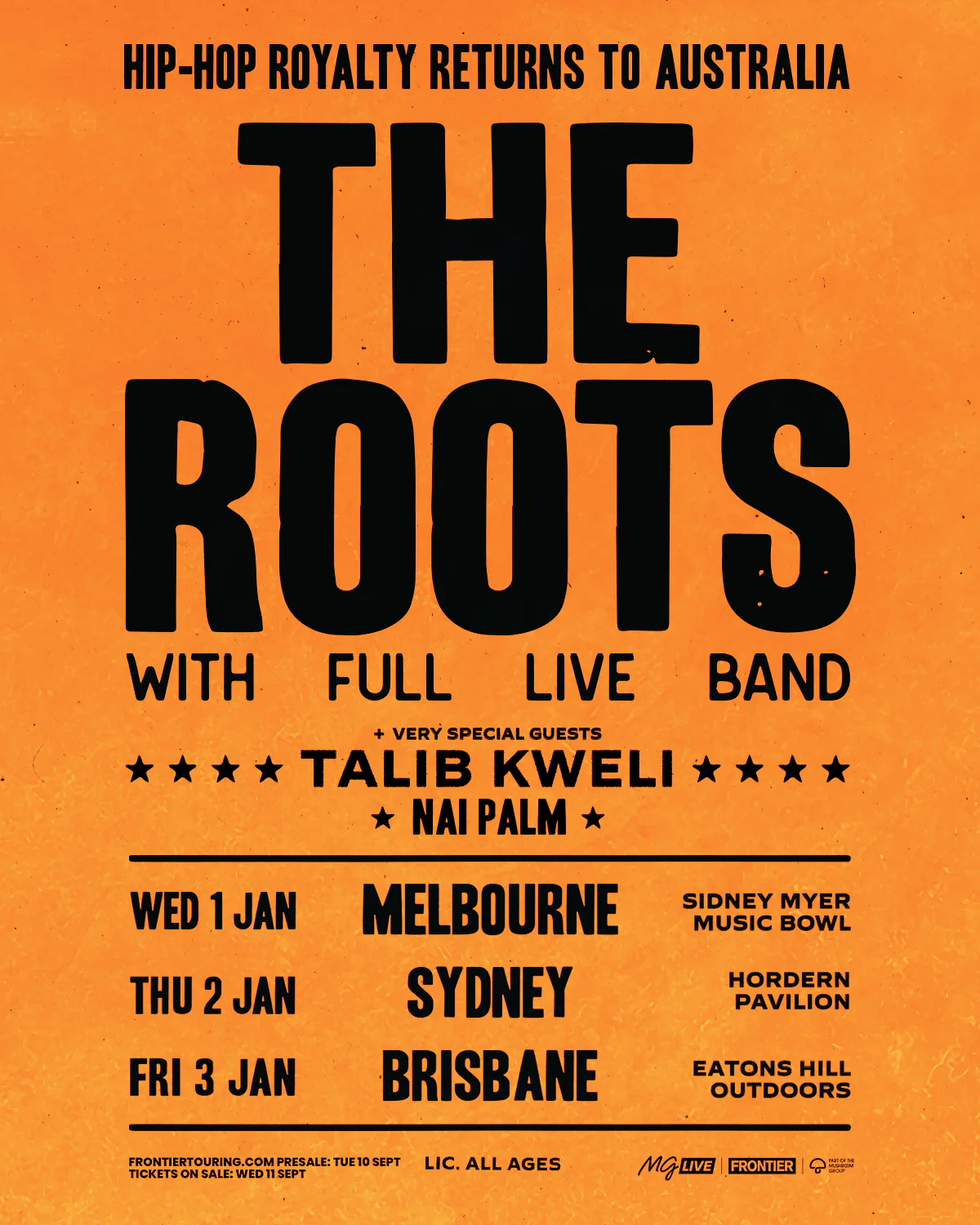 Frontier Member presale commences Tuesday 10 September from 1pm local before tickets go on sale Wednesday 11 September from 2pm local time. Tickets via frontiertouring.com/theroots